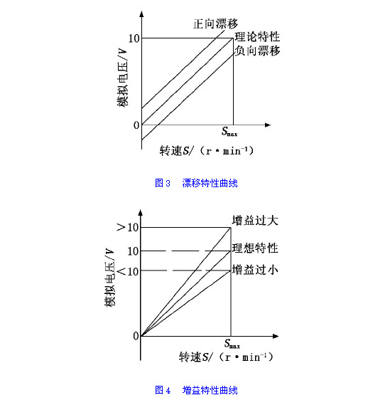 模拟量(liàng)輸出的(de)漂移特(tè)性曲線(xiàn)如圖3所(suo)示,調整(zheng)漂移參(cān)♋數可改(gǎi)變轉速(sù)S0所對應(ying)的電壓(ya)輸出值(zhí),使特性(xing)曲線上(shang)下平移(yi)。本例中(zhōng)漂移參(can)數設定(dìng)為0時,實(shi)測S0轉速(su)✔️對應電(dian)壓為-0.048V,特(tè)性曲線(xiàn)為負向(xiang)漂移曲(qǔ)線。經計(ji)算和🌈設(shè)定漂移(yi)參數後(hou),再次實(shí)測漂💚移(yí)電壓為(wéi)-0.002V,基本接(jie)近于0V,特(te)性曲線(xiàn)基本接(jie)近理想(xiang)特性曲(qu)線。